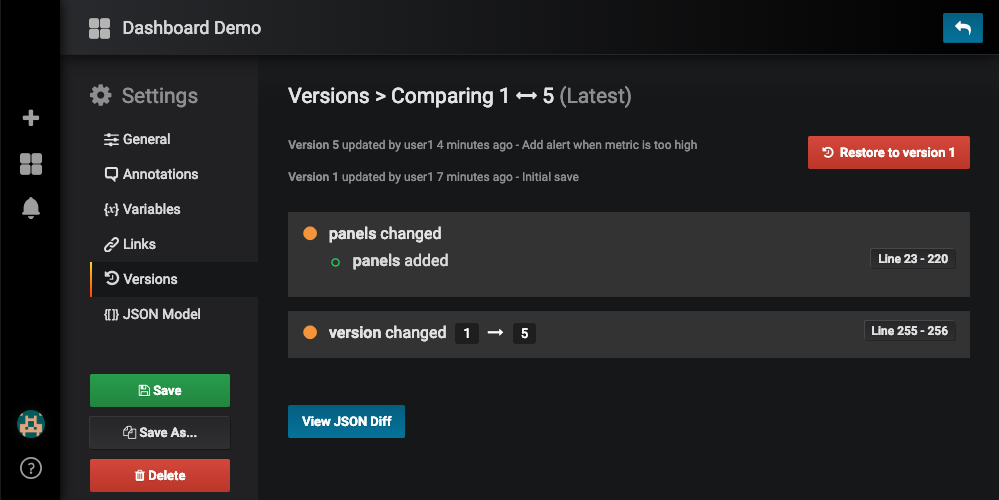 If you want to view the diff of the raw JSON that represents your dashboard, you can do that as well by clicking the “View JSON Diff” button at the bottom.