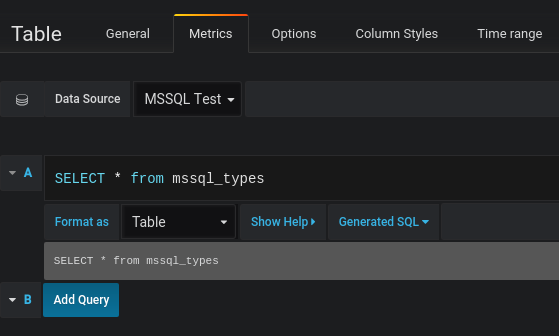 You will find the MSSQL query editor in the metrics tab in Graph, Singlestat or Table panel’s edit mode. You enter edit mode by clicking the panel title, then edit. The editor allows you to define a SQL query to select data to be visualized.