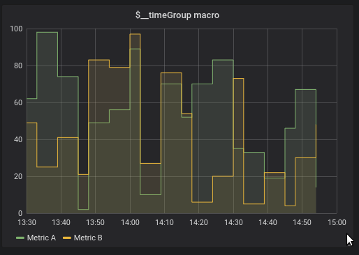 We’re mimicking the $__timeGroup(time, '5m') in the select and group by expressions, and that’s why there are a lot of lengthy expressions needed -