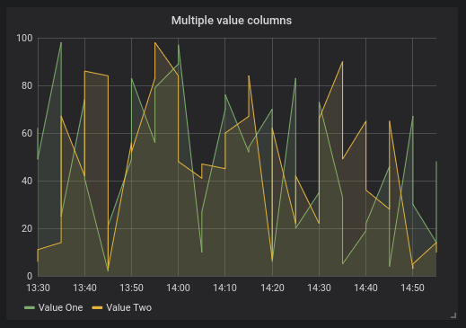 For the following examples, the database table is defined in Time series queries. Let’s say that we want to visualize four series in a graph panel, such as all combinations of columnsvalueOne, valueTwo and measurement. Graph panel to the right visualizes what we want to achieve. To solve this, we need to use two queries: