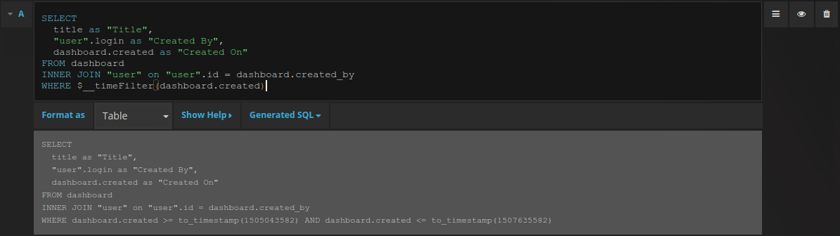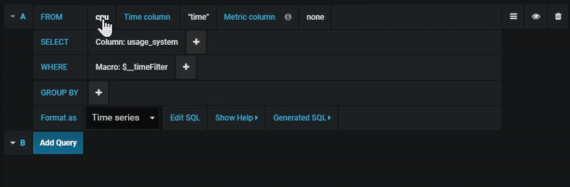 You find the PostgreSQL query editor in the metrics tab in Graph or Singlestat panel’s edit mode. You enter edit mode by clicking the panel title, then edit.