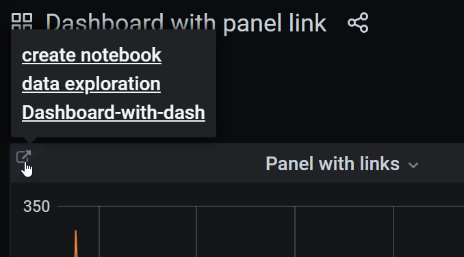 Each panel can have its own set of links that are shown in the upper left corner of the panel. You can link to any available URL, including dashboards, panels, or external sites. You can even control the time range to ensure the user is zoomed in on the right data in SmartCollect SC².