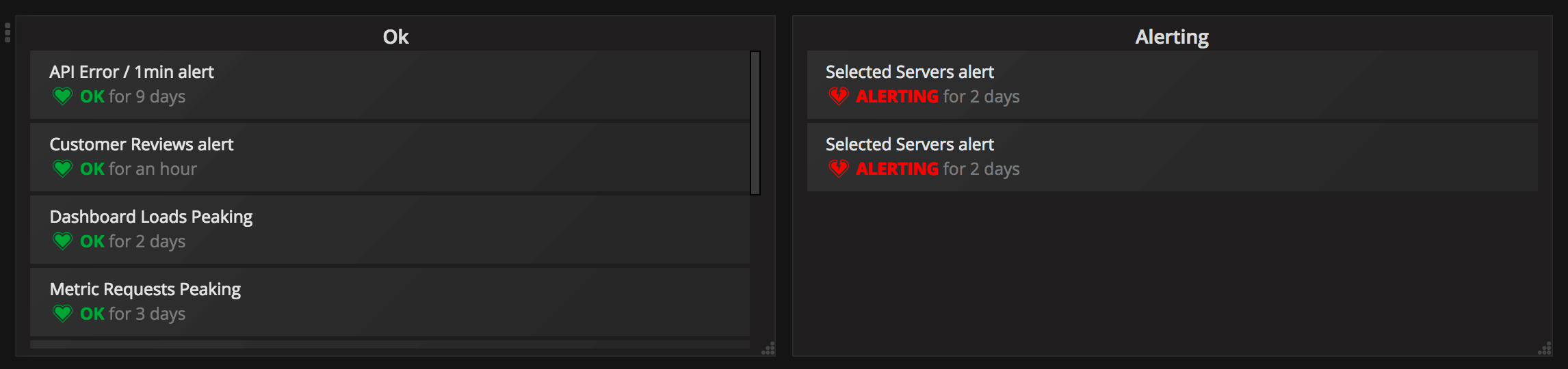 The Alert list panel allows you to display your dashboards alerts. You can configure the list to show current state or recent state changes. You can read more about alerts in Alerts overview.