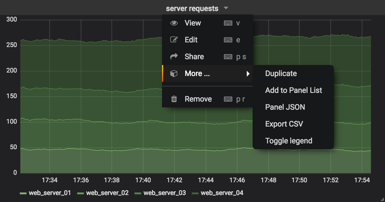 - The panel JSON (the specification and not the data) can be exported or updated via the panel context menu.