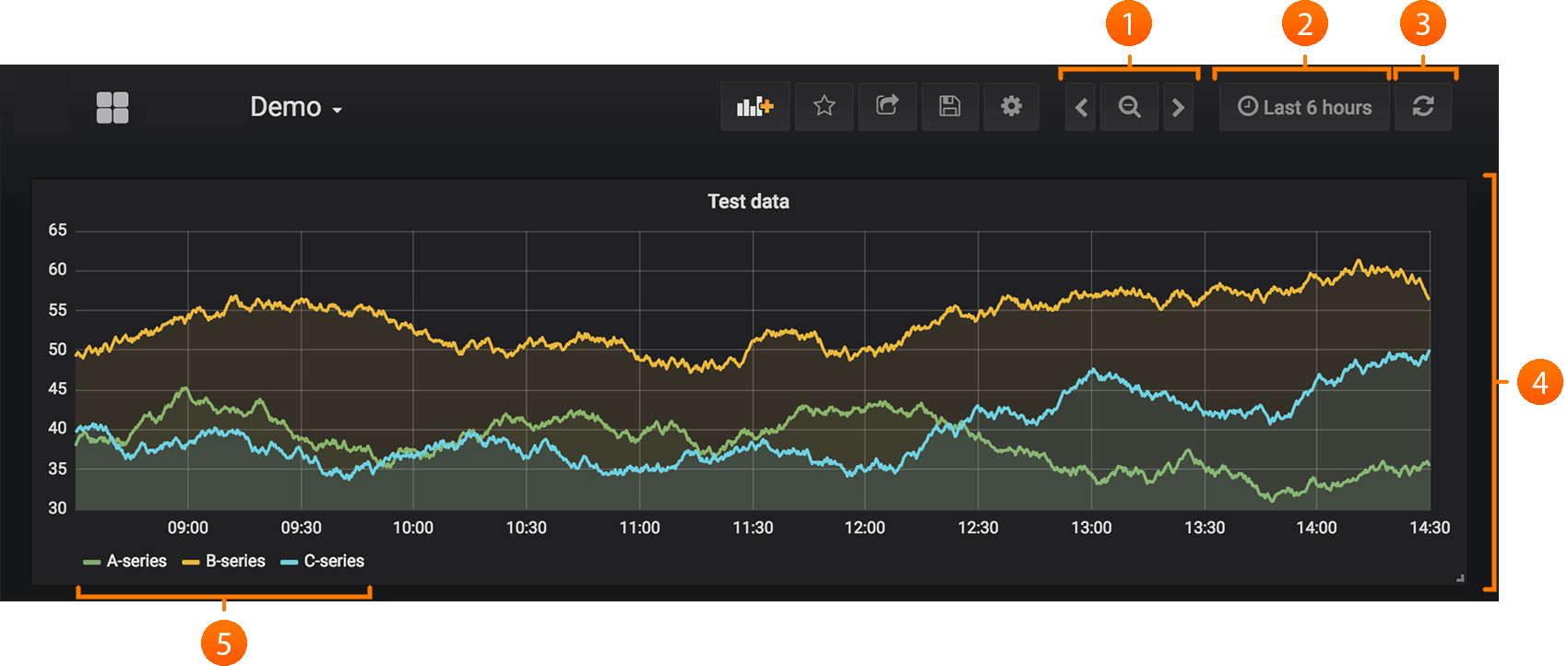 - Time picker dropdown. Here you can access relative time range options, auto refresh options and set custom absolute time ranges.