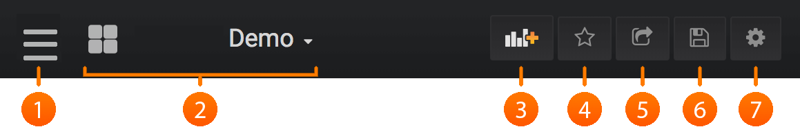 - Dashboard dropdown: This dropdown shows you which Dashboard you are currently viewing, and allows you to easily switch to a new Dashboard. From here you can also create a new Dashboard or folder, import existing Dashboards, and manage Dashboard playlists.