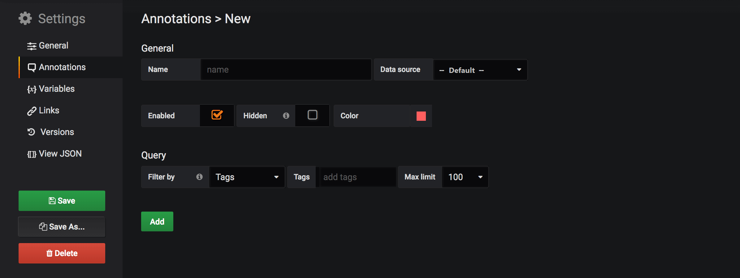 settings view. To create a new annotation query hit the New button.