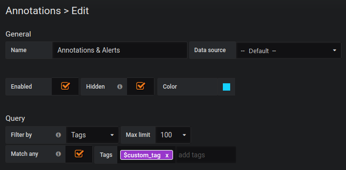 In SmartCollect SC² v5.3+ it’s possible to use template variables in the tag query. So if you have a dashboard showing stats for different services and a template variable that dictates which services to show, you can now use the same template variable in your annotation query to only show annotations for those services.