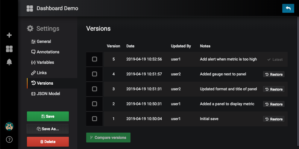 Whenever you save a version of your dashboard, a copy of that version is saved so that previous versions of your dashboard are never lost. A list of these versions is available by entering the dashboard settings and then selecting “Versions” in the left side menu.