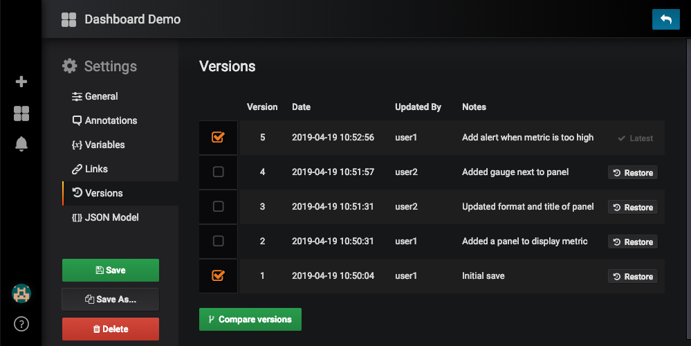 To compare two dashboard versions, select the two versions from the list that you wish to compare. Once selected, the “Compare versions” button will become clickable. Click the button to view the diff between the two versions.
