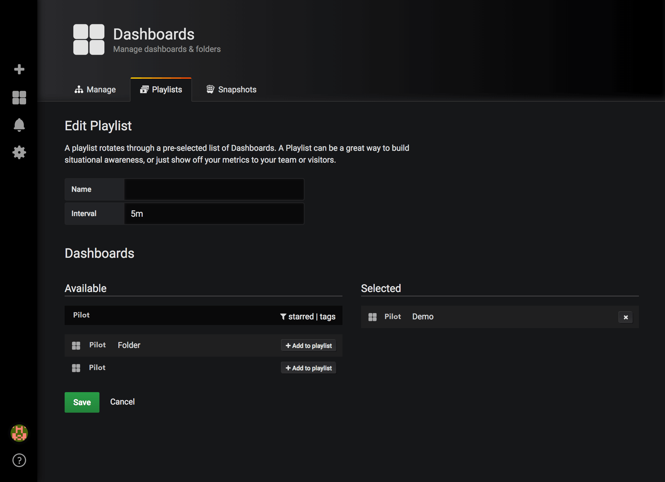 By default, your starred dashboards will appear as options to add to the Playlist. - Click Save to save your changes.