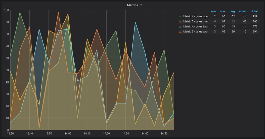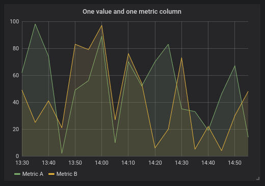 For the following examples, the database table is defined in Time series queries. Let’s say that we want to visualize four series in a graph panel, such as all combinations of columnsvalueOne, valueTwo and measurement. Graph panel to the right visualizes what we want to achieve. To solve this, we need to use two queries: