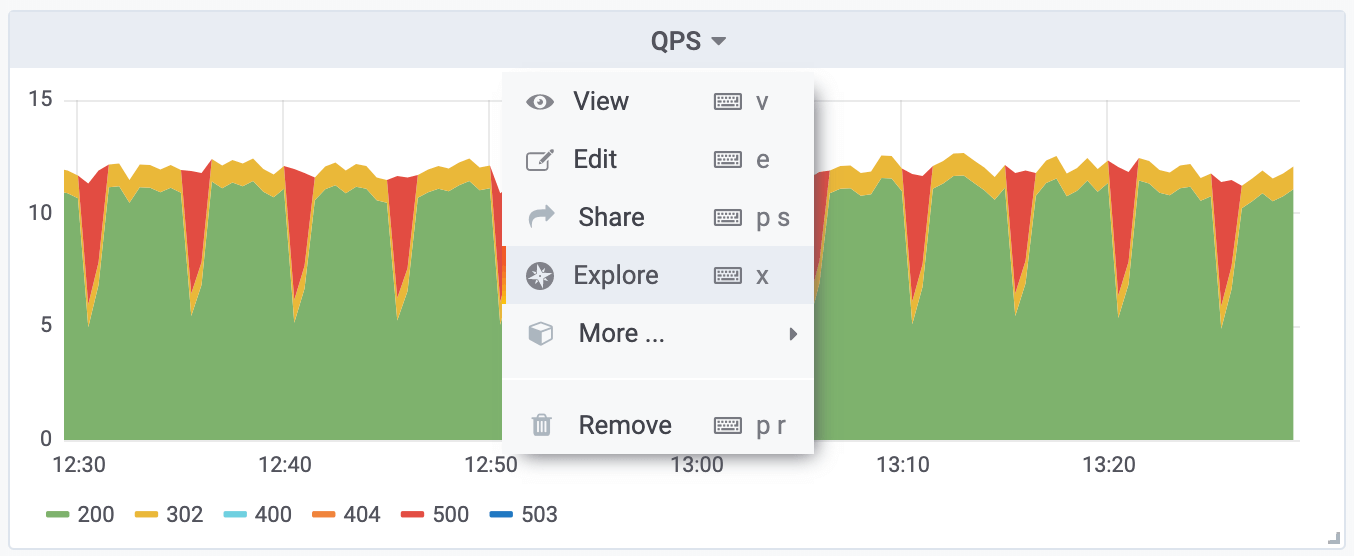 If you want to start with an existing query in a panel, choose the Explore option from the Panel menu. This opens an Explore tab with the query from the panel and allows you to tweak or iterate in the query outside of your dashboard.